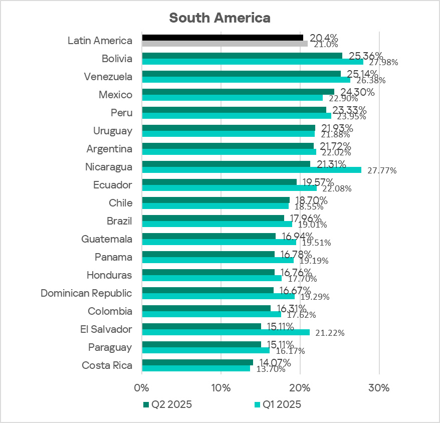 México (24%) y Perú (23%) también figuran entre los países con mayor actividad maliciosa, impulsada principalmente por correos electrónicos y sitios web comprometidos.