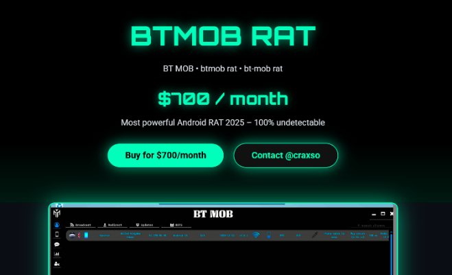 ESET también identificó que BTMOB se ofrece como servicio en una página web accesible desde la web abierta. La página es simple y redirige mediante enlaces a un contacto en Telegram para adquirir el malware.