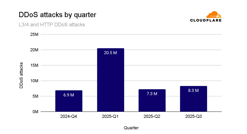 En solo tres meses, Cloudflare mitigó 8.300.000 de ataques DDoS, el equivalente a 3.780 ataques por hora, mientras 2025 ya acumula 36.200.000, es decir, 170% más que todo lo registrado en 2024 con un trimestre aún por delante.