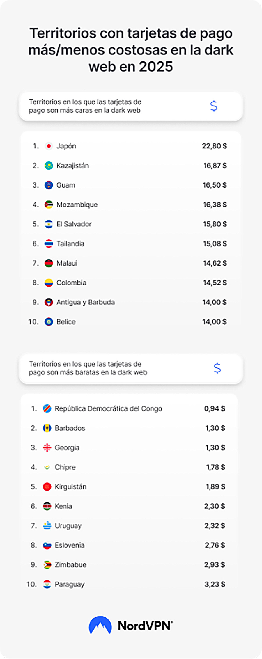 Las tarjetas estadounidenses robadas están en la mitad de la lista, a USD 11,51. Las más caras vienen de Japón, con un precio aproximado de USD 23. En la parte baja, las tarjetas de República del Congo, Barbados y Georgia pueden venderse por USD 1.