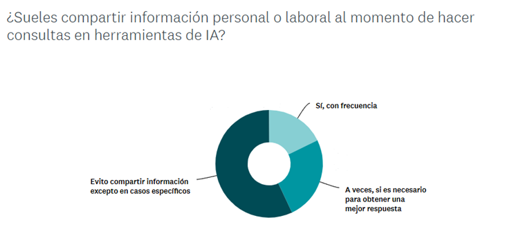 Otro punto relevante fue que el 40% de los encuestados afirmó compartir con frecuencia o esporádicamente información personal y laboral con la IA (el 17% siempre y el 25% a veces). Además, casi el 60% no lee las políticas de privacidad y solo la mitad de las personas toma alguna medida concreta para proteger su información.