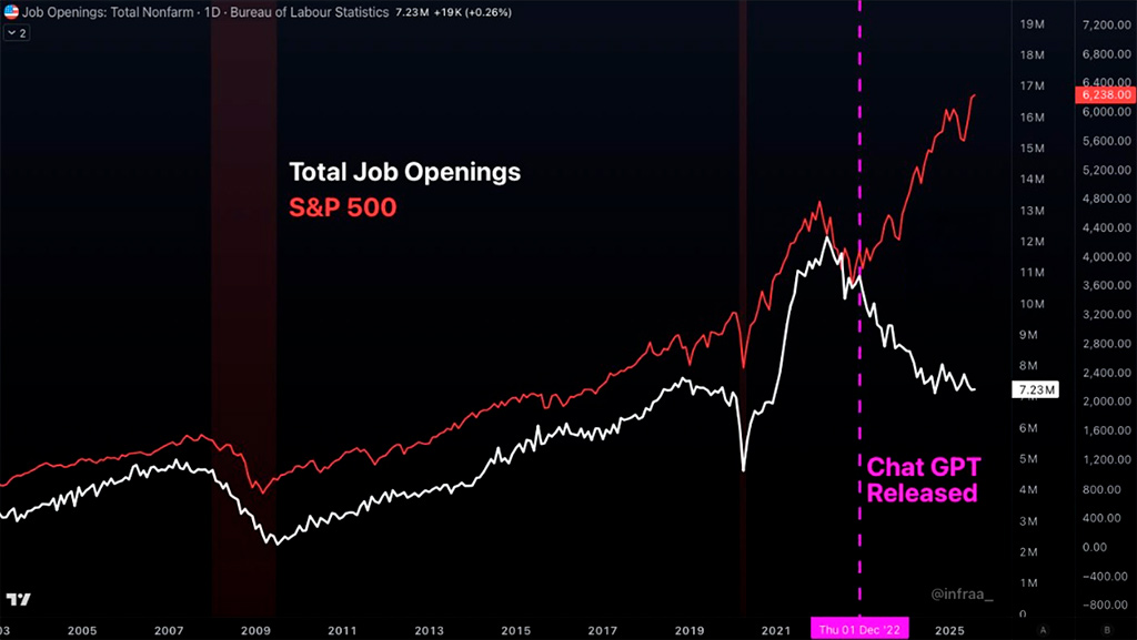 El siguiente gráfico muestra la brecha que se ha generado desde el lanzamiento de ChatGPT, entre la valoración de mercado de las empresas que componen el SP500 y las nuevas solicitudes de empleo en el mismo mercado.