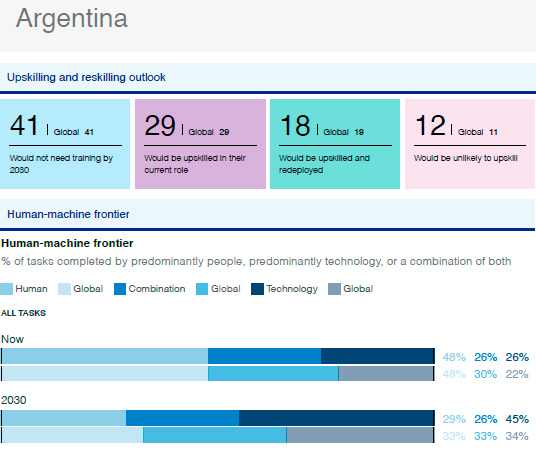El World Economic Forum, en su informe Future of Job, que dedica un apartado a Argentina, proyecta que para 2030 el porcentaje de tareas humanas reemplazadas por tecnología crecerá un 76%, pasando del 26% actual al 45%. En el extremo opuesto, solo un 29% de las tareas operativas serían ejecutadas exclusivamente por humanos.