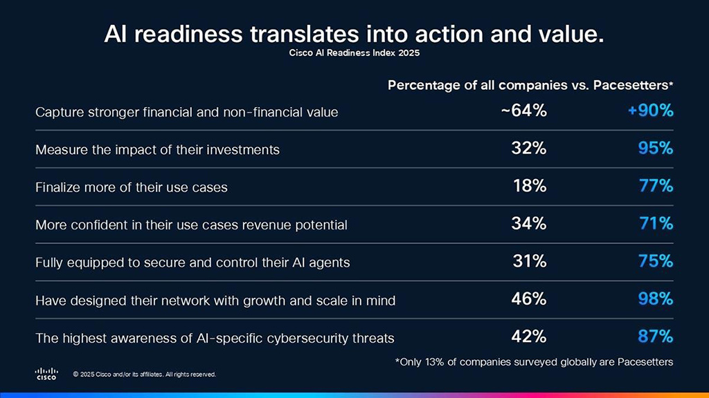 Un grupo reducido pero constante de empresas, los Pacesetters, que representan alrededor del 13% de las organizaciones de los últimos tres años, superan a sus competidoras en todas las medidas de valor de la IA, según el estudio global de Cisco realizado a más de 8.000 líderes en IA de 30 mercados y 26 sectores.
