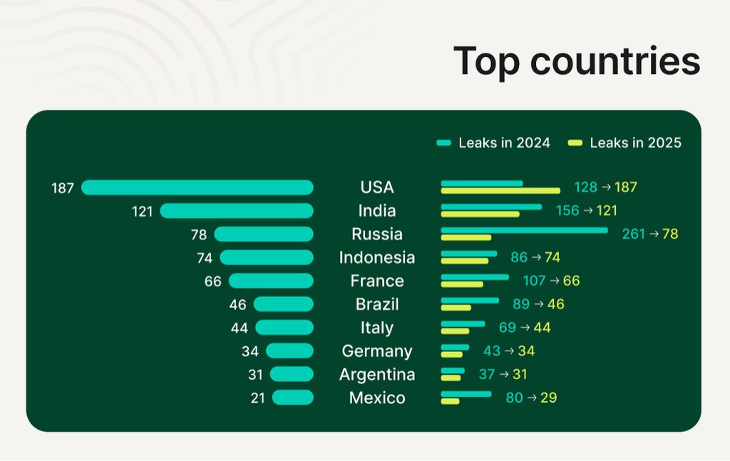 Entre los países más afectados durante 2025 aparecen Estados Unidos e India, con 187 y 121 filtraciones, respectivamente.