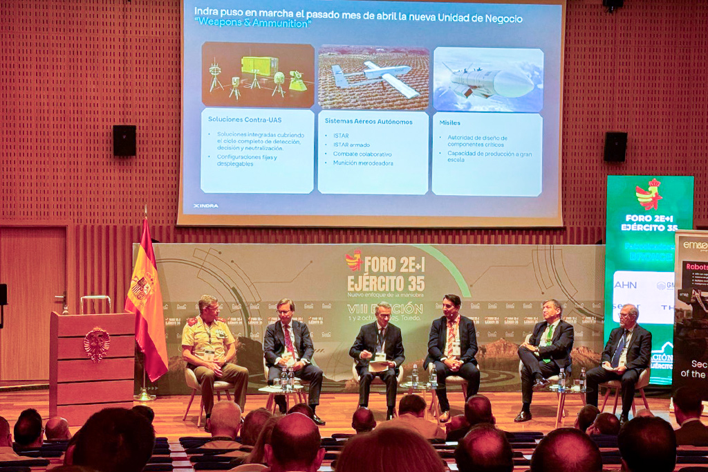 Indra presentó en la octava edición del Foro 2E+I Ejército 35, que reunió a mandos militares y responsables de la industria, varias de sus soluciones clave para operaciones terrestres de máxima intensidad, centradas en la robotización del campo de batalla, la protección frente a ataques con drones y la superioridad de fuegos para contrarrestar la artillería enemiga.