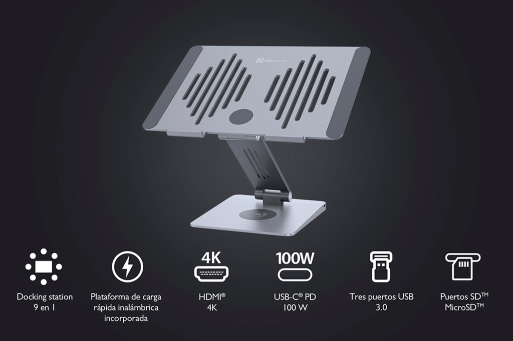 Esta Docking Station híbrida redefine la productividad al combinar en un solo diseño un versátil hub 9 en 1, un soporte ergonómico ajustable para notebooks y una práctica plataforma de carga inalámbrica.