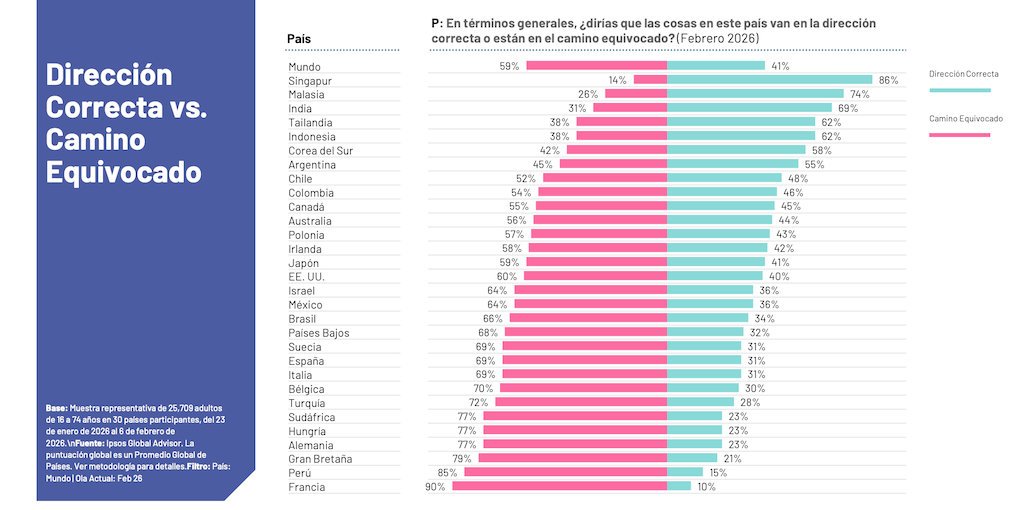 A pesar de esto, Argentina destaca como el país más optimista de la región respecto al rumbo general, con un 55% de los ciudadanos que considera que el país avanza correctamente.