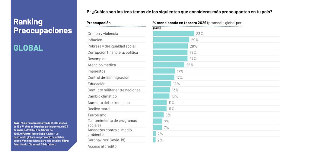 Los resultados muestran que la violencia y el crimen se consolidan como la mayor inquietud global, mencionada por el 33% de los encuestados.