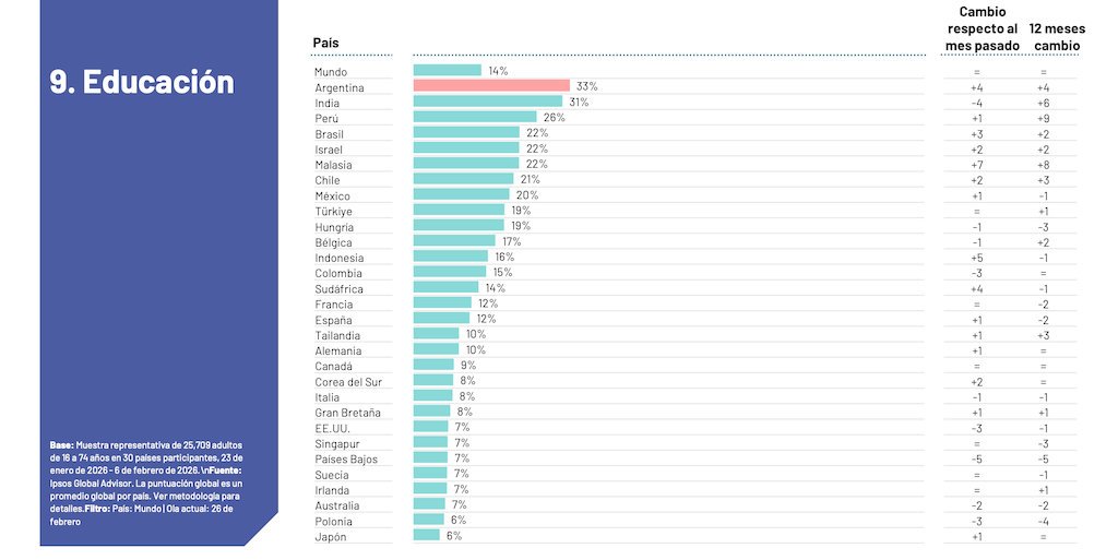 En contraste, la preocupación por la educación en Argentina alcanza el 33%, superando a países como Perú (26%) o Brasil (22%).