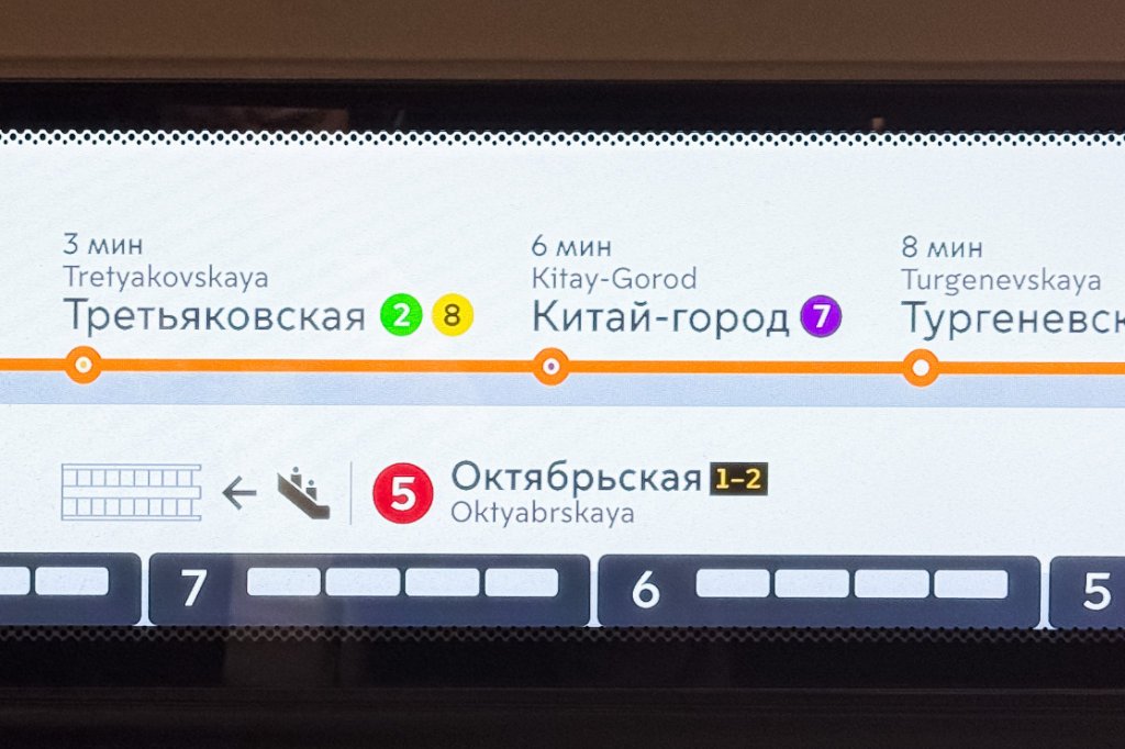 Para mejorar la navegación dentro de los vagones, los números de salida en los nodos de transbordo han comenzado a aparecer sobre las puertas de los trenes de las series «Moskva-2020» y «Moskva-2024».