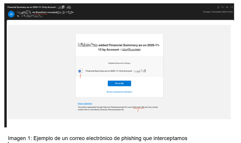 También falsificaban nombres para mostrar como “X vía SharePoint (Online)”, “eSignDoc vía Y” y “SharePoint”, que coincidían estrechamente con los patrones de notificación auténticos.