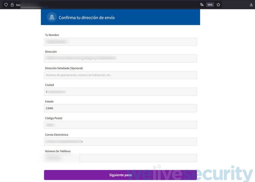 Después de seleccionar el producto, se dirige a la víctima a un formulario donde se le pide confirmar sus datos e ingresar información personal como nombre, dirección, correo electrónico, entre otros.