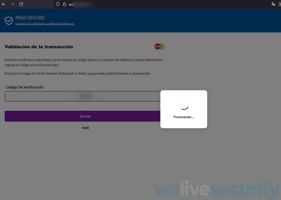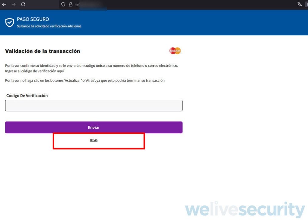 Después de unos segundos de la validación de la tarjeta, se envía un “código de verificación” que la víctima recibe por SMS o por correo electrónico y debe introducir en el sitio web donde se pone un temporizador para generar más presión.